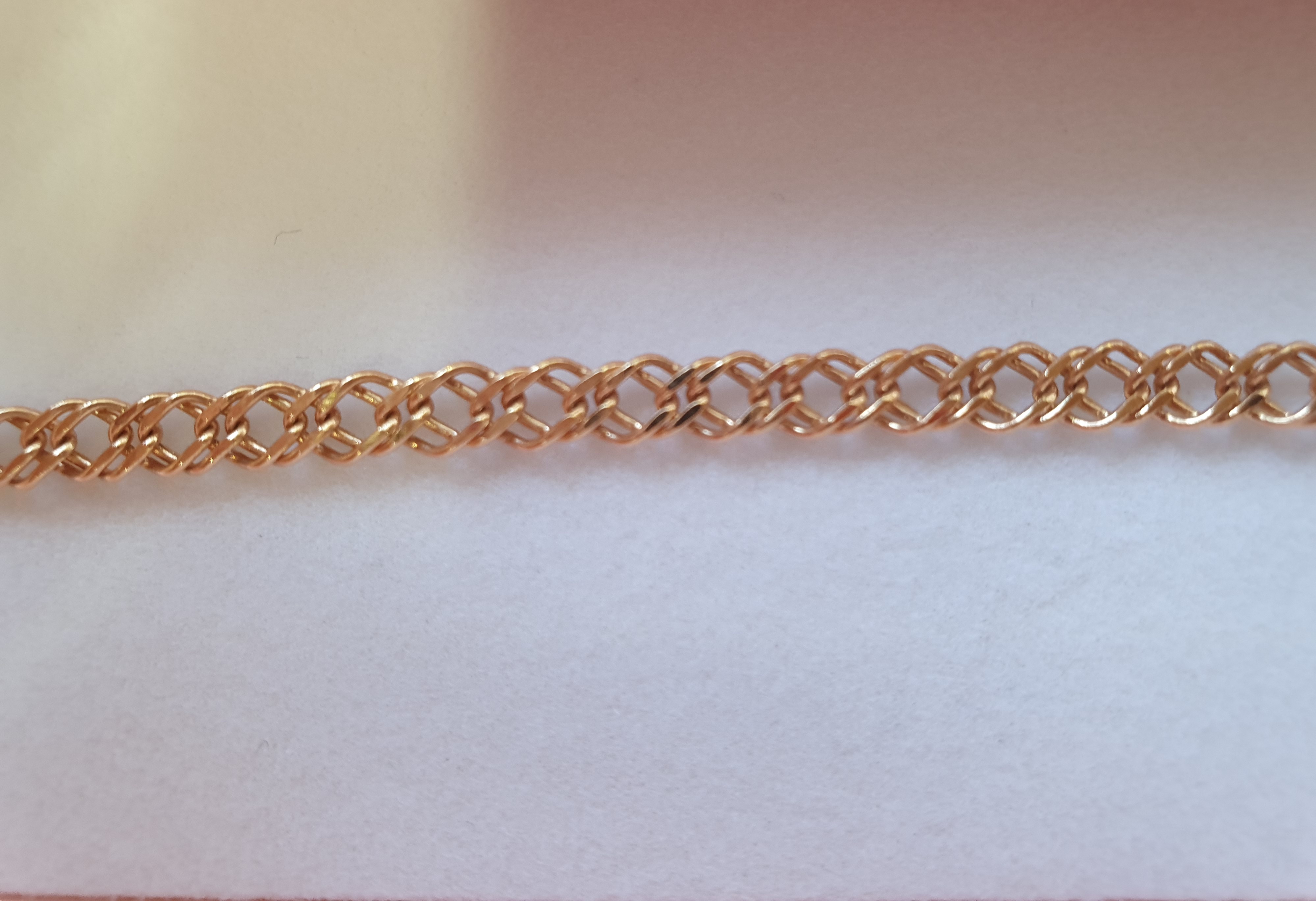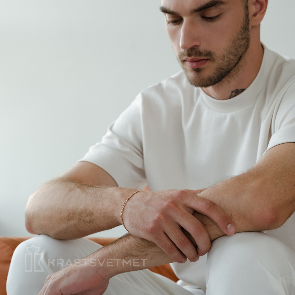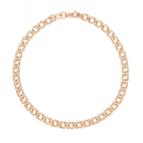 Облегченный браслет из красного золота 585 пробы приятно удивляет стилем плетения «двойной ромб» и красивой отделкой алмазной гранью