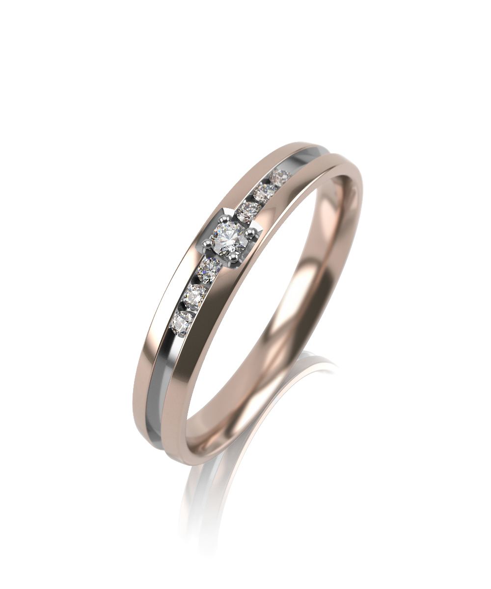 Стильное парное обручальное кольцо, выполнено в сочетании красного и белого золото с семью бриллиантами.