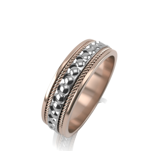 Стильное обручальное кольцо из белого и красного золота с ювелирной зернью