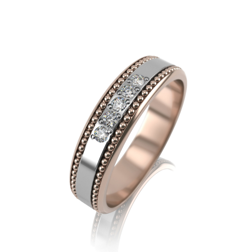 Стильное обручальное кольцо, выполненное в сочетании красного и белого золота 585 пробы с ювелирной зернью.