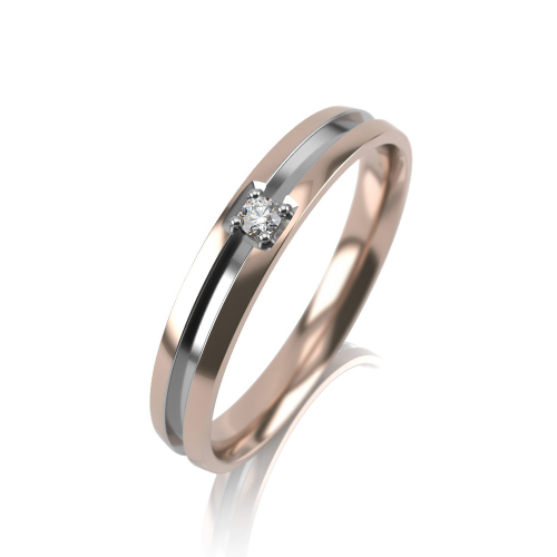 Стильное парное обручальное кольцо, выполнено в сочетании красного и белого золото с одним бриллиантом.