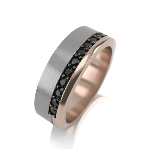 Обручальное кольцо, выполненное в сочетании белого и красного золота 585 пробы, украшенное россыпью черных бриллиантов.