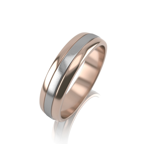 Оригинальное обручальное кольцо из двух цветов золота 585 пробы, основание кольца выполнено из красного золота, а середина из белого золота, которая обработана в технике декоративного текстурирования поверхности. Такой вид обработки придает кольцу особый перелив поверхности и мягкий, нежный блеск.