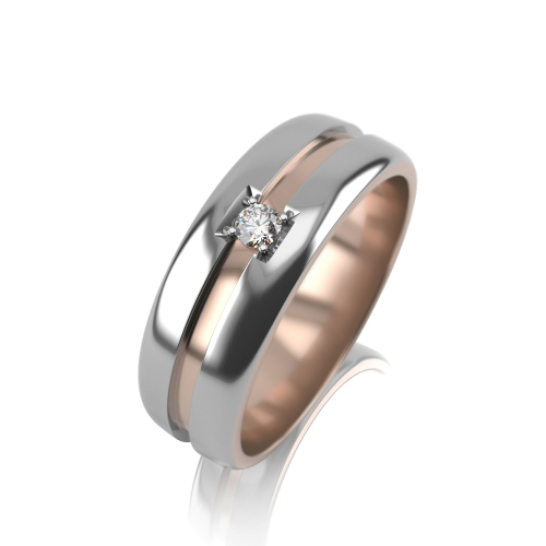 Полновесное обручальное кольцо из красного и белого золота 585 пробы, форма кольца прямая "шайба", со вставкой из бриллианта, который придает искрящийся блеск. Камень не выступает относительно поверхности кольца, за счет глухой закрепки, она надежно удерживает бриллиант.