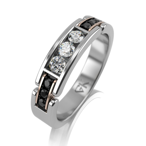 Оригинальное обручальное кольцо, выполненное в сочетании красного и белого золота 585 пробы, украшенное черно-белыми бриллиантами
