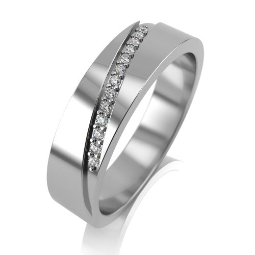 Полновесное классическое обручальное кольцо из белого золота 585 пробы, форма кольца прямая "шайба", альтернатива классическому обручальному кольцу полукруглой формы, с красивыми искрящимися скощенными краями. В кольце имеется вставка из россыпи бриллиантов, которые придают нежный, искрящийся блеск. Камни не выступают относительно поверхности кольца, за счет глухой закрепки, она надежно удерживает бриллиант.