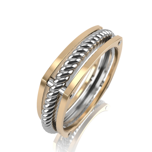 Оригинальное обручальное кольцо, выполненное в сочетании белого и желтого золота 585 пробы.