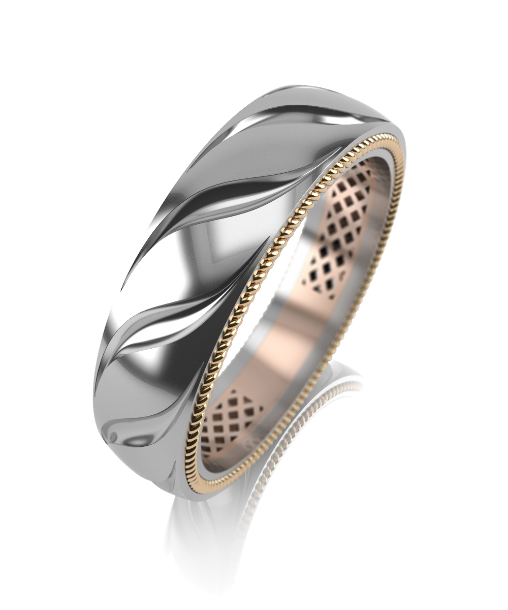 Оригинальное обручальное кольцо, выполненное в сочетании красного и белого золота 585 пробы. Современные кольца - выбор пар, идущих в ногу со временем. В этой модели обручальных колец отображены как популярные современные тенденции ювелирной моды, так и классические приёмы ювелирных технологий. Изделие представлено брендом "GRAF КОЛЬЦОВ". В комплект поставки входит: