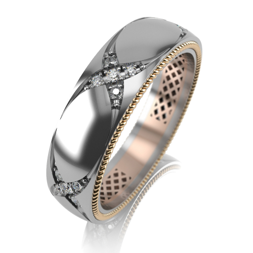 Оригинальное обручальное кольцо, выполненное в сочетании красного и белого золота 585 пробы, украшенное россыпью бриллиантов