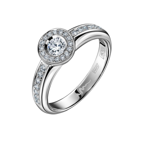Кольцо с роскошным бриллиантом в центре в касте круглой формы, украшенном бриллиантами меньшего размера, выполнено из белого золота 750 пробы. Шинка кольца так же украшена дорожкой из сверкающих бриллиантов. Бриллианты на белом золоте смотрятся особенно эффектно, такое украшение просто приковывает взгляд своим блеском и красотой. Изделие представлено брендом "АРТ-МОДЕРН". Средняя характеристика камней на артикул: 1 бриллиант, круглой огранки, весом 0,18 карат с характеристиками 3/5А, 30 бриллиантов, круглой огранки, общим весом 0,23 карата с характеристиками 3/5А. К украшению прилагается сертификат от производителя о подлинности драгоценных камней. В комплект поставки входит: