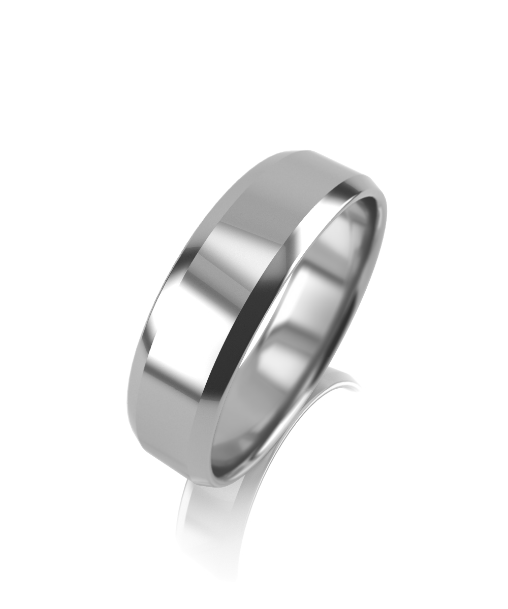 Полновесное обручальное кольцо с прямым профилем "шайба", выполнено из белого золота 585 пробы, особую оригинальность кольцу придают ускрящиеся скошенные края в сочетании с идеально гладкой поверхностью кольца