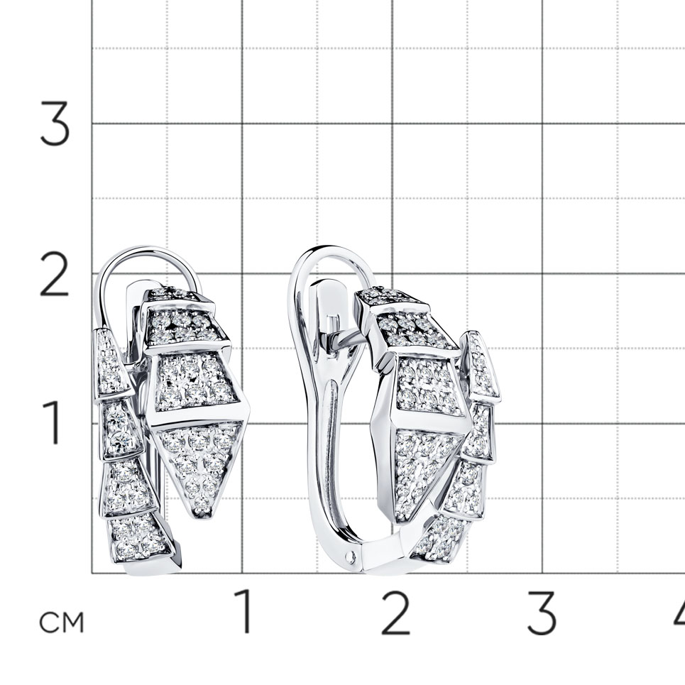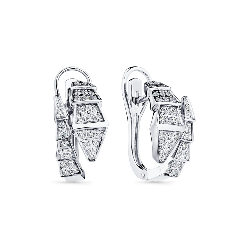 Серьги с оригинальным дизайном из геометричных звеньев, украшенных россыпью бриллиантов, выполнены из белого золота 585 пробы. Украшение универсальное и подойдёт как для более торжественных, так и для повседневных образов. Тип замка - английский, самый надежный и удобный.
