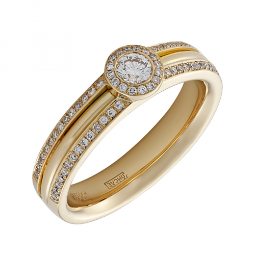 Изящное кольцо из желтого золота 750 пробы украшено дорожкой сверкающих бриллиантов, которые ведут взгляд к одному центральному бриллианту