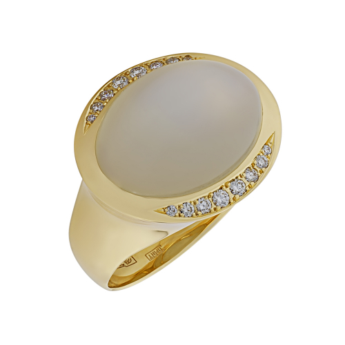 Уникальное кольцо из желтого золота 750 пробы с лунным камнем и бриллиантами привлекает внимание своей таинственной красотой