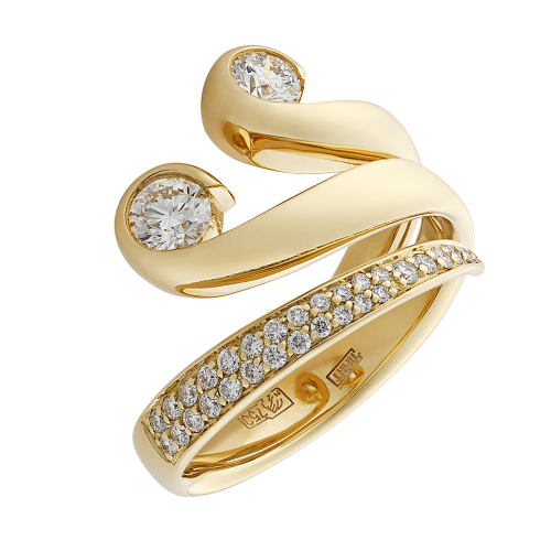 Кольцо из желтого золота 750 пробы необычного дизайна с бриллиантами — это яркое выражение индивидуального стиля