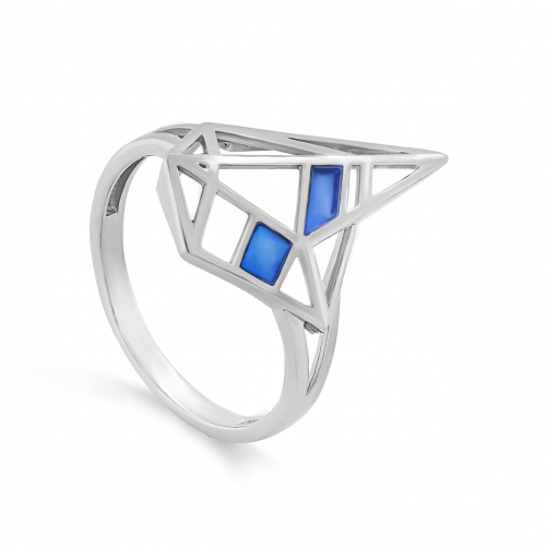 Изящное кольцо в геометрическом стиле, украшенное ювелирной эмалью, выполнено из родированного серебра 925 пробы