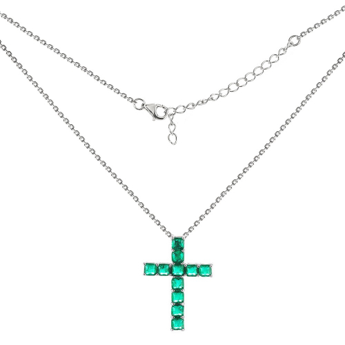 Изящное цепочное колье с подвеской в виде декоративного креста, украшенного зелёными циркониями, выполнено в серебре 925 пробы, покрыто родием