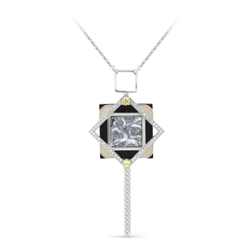 Стильное цепочное колье с оригинальной подвеской, украшенной жёлтыми и бесцветными фианитами, выполнено из родированного серебра 925 пробы