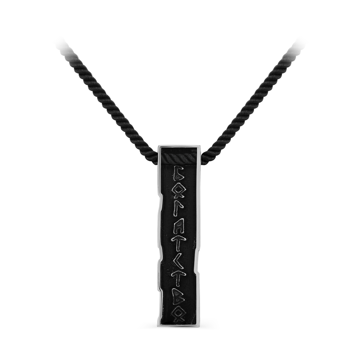 Колье на лавсановом чёрном шнуре с подвеской украшенной надписью "БОГАТСТВО", выполненной из родированного серебра 925 пробы с керамикой