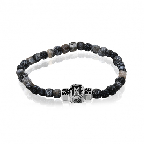 Стильный браслет выполнен из бусин агата, украшен вставкой из родированного серебра 925 пробы с руной "Дагаз"
