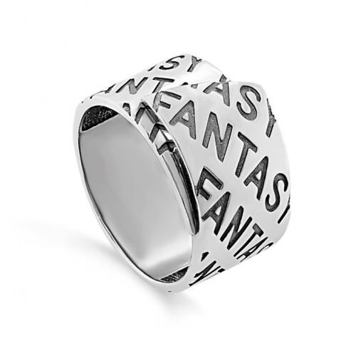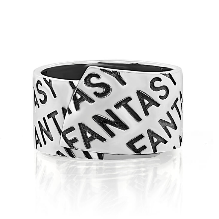 Стильное кольцо, украшенное надписью Фантазия выполнено из родированного серебра 925 пробы