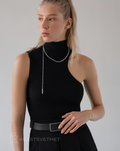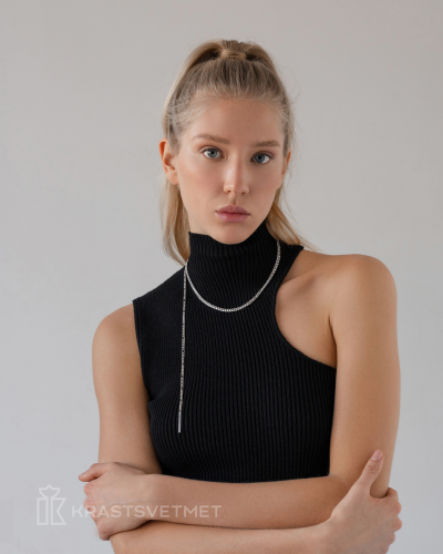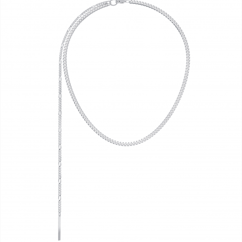 Ассиметричное колье-галстук с основой из гурметы (d 1,2 мм) и спадающим полотном из фигаро 5+1 (d 0,8мм) с акцентом в виде прямоугольной пластины (2,5х26 мм) выполнено из серебра 925 пробы