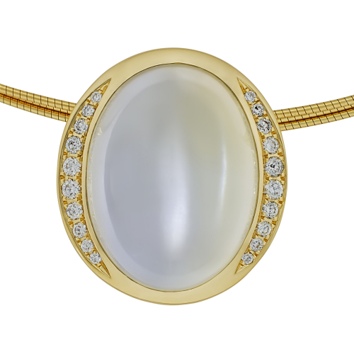 Изящная подвеска из желтого золота 750 пробы очаровывает своим дизайном. В центре композиции — загадочный лунный камень, украшенный дорожками мерцающих бриллиантов. Представлено брендом АРТ-МОДЕРН. Вставки: 1 лунный камень, общим весом 15,5, 20 бриллиант круглой огранки, общим весом 0,23 карат с характеристиками 3/4А В комплект поставки входит: