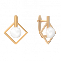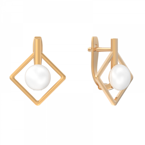 Оригинальные серьги в стиле минимализм с белыми жемчужинами выполнены из красного золота 585 пробы
