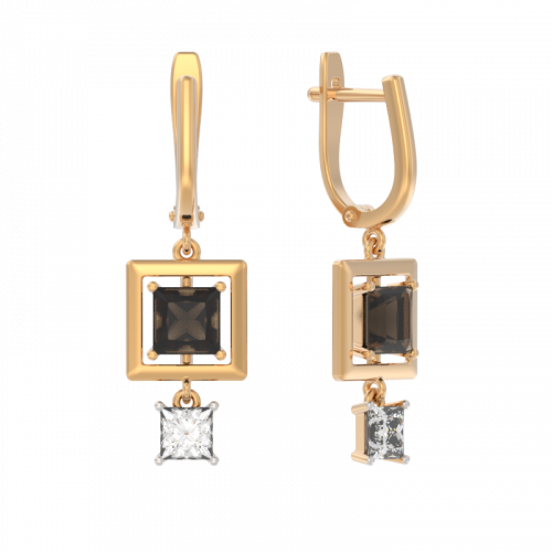 Серьги оригинального современного дизайна выполнены в красном и белом золоте 585 пробы. Подвесная часть каждой серьги украшена коричневым раух-топазом и ярким фианитом. Тип замка - английский, самый надежный и удобный. Изделие представлено брендом АРИНА. В комплект поставки входит: