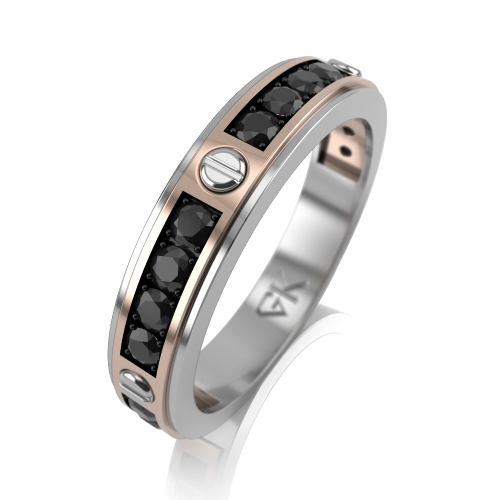 Обручальное кольцо, выполненное из сочетания красного и белого золота, украшенное черными бриллиантами