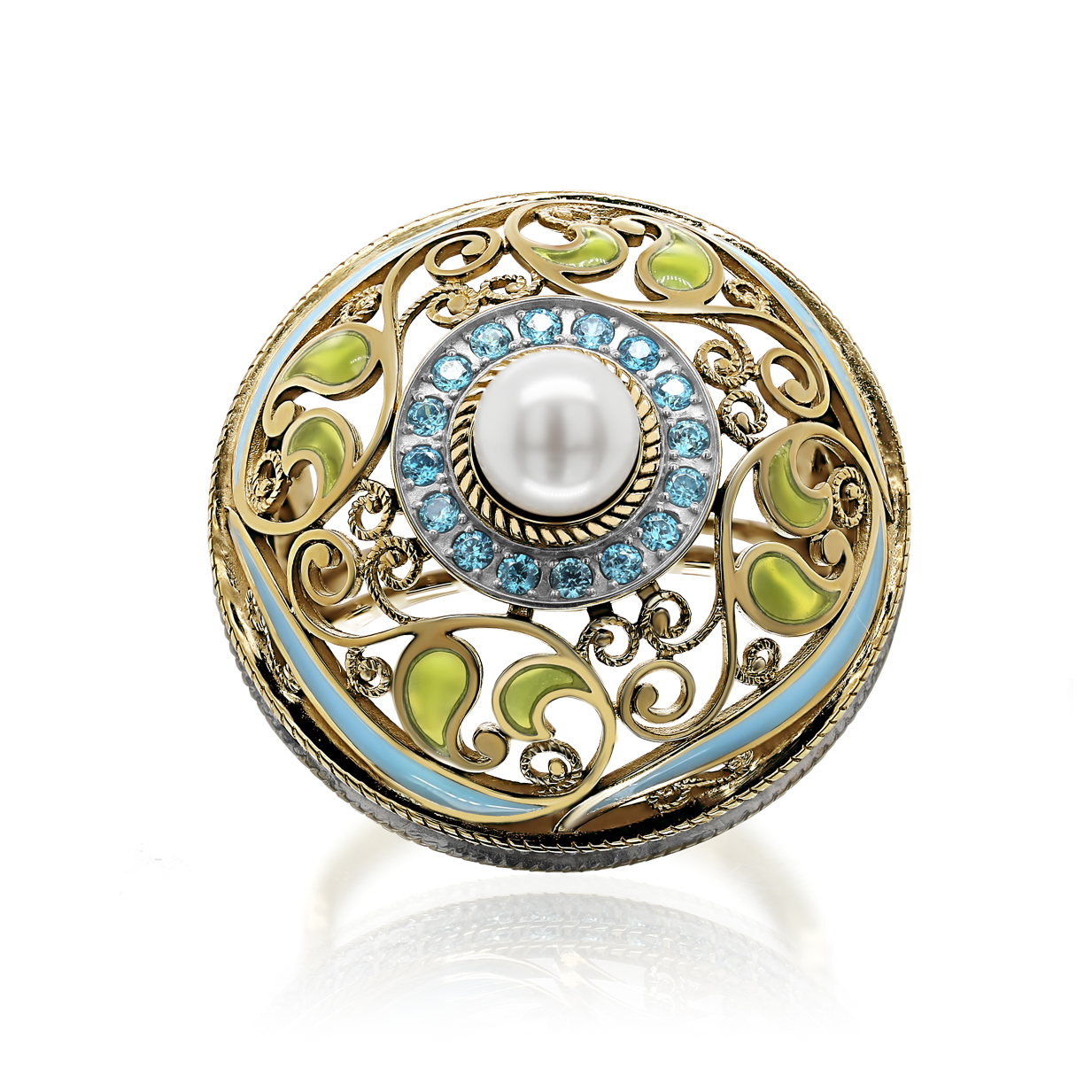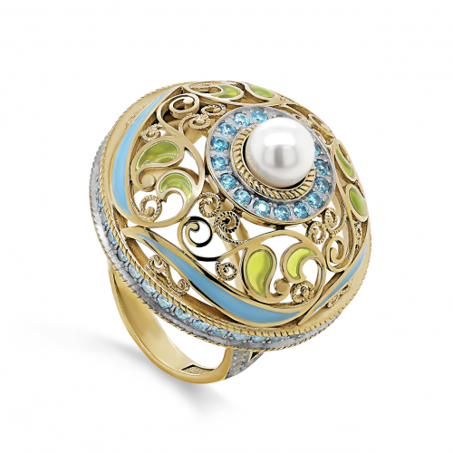 Роскошное кольцо выполнено из позолочёного серебра 925 пробы, украшено жемчугом, нежную красоту которого подчёркивают дорожки голубых фианитов и цветная эмаль