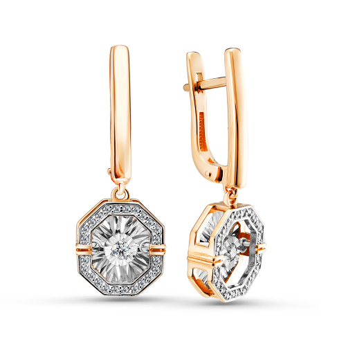 Роскошные длинные серьги с подвесом оригинального дизайна, выполнены из красного и белого золота 585 пробы, украшены великолепными сияющими бриллиантами