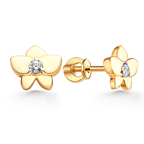 Нежные серьги, в виде цветочков, выполнены из красного золота 585 пробы, украшены двумя искрящимися фианитами.
