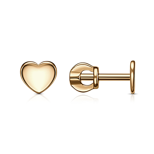 Романтичные серьги - пусеты, в виде сердечка, выполнены из красного золота 585 пробы
