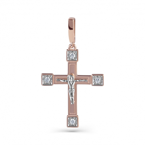 Православный крест выполнен в сочетании красного и белого золота 585 пробы. Украшен искрящимися бриллиантами.