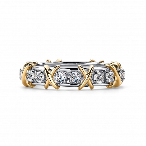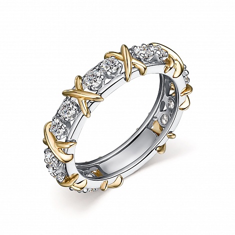 Яркое стильное кольцо с роскошным сочетанием белого и жёлтого золота 585 пробы, украшенное сверкающими бриллиантами