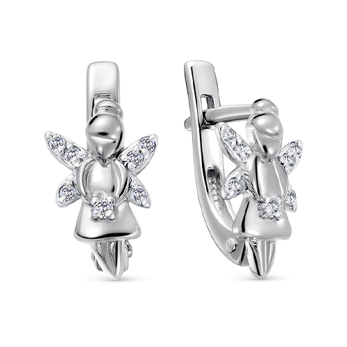 Нежные детские серьги, в виде ангелов, выполнены из белого золота 585 пробы и украшены сияющими фианитами
