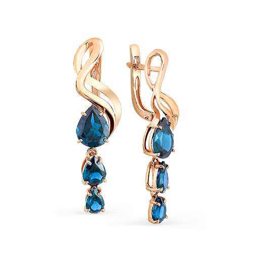 Роскошные удлинённые серьги с синими London топазами выполнены из красного золота 585 пробы