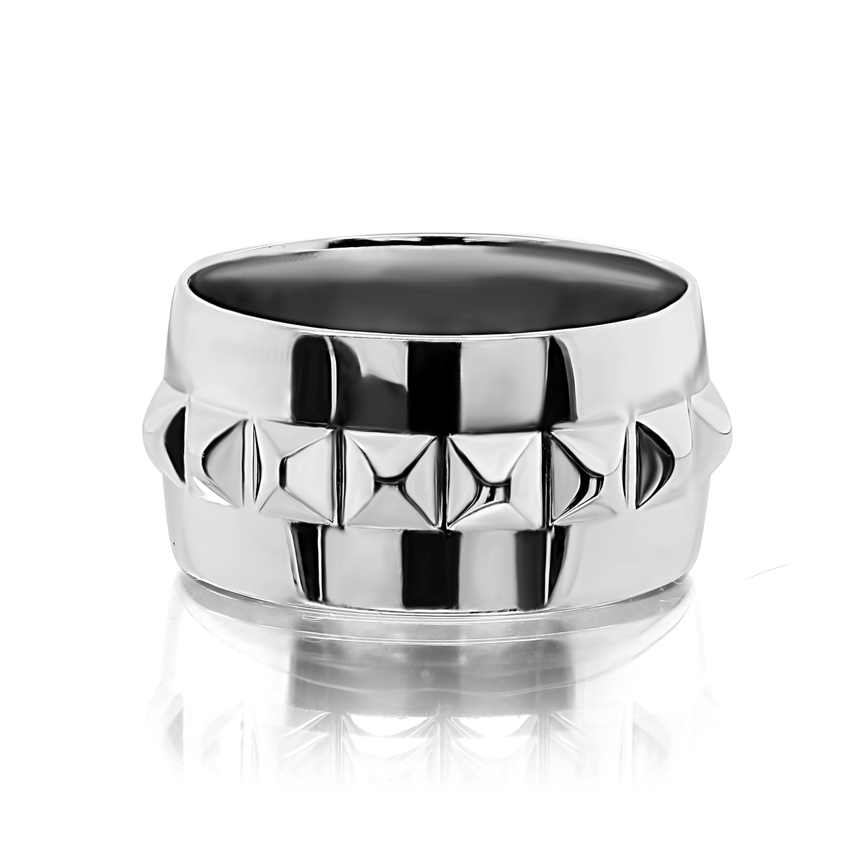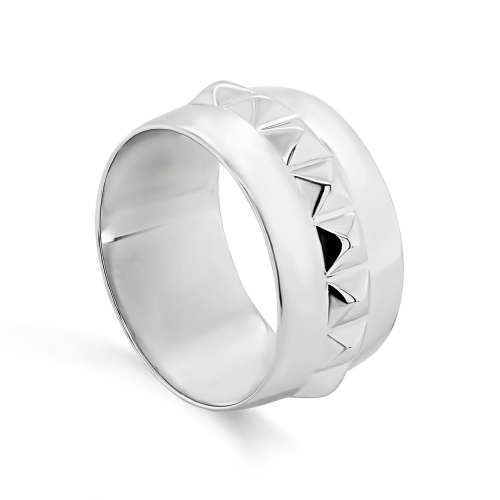 Широкое кольцо с рельефным дизайном, выполнено из серебра 925 пробы. Украшение покрыто металлом платиновой группы родием, что препятствует потемнению серебра и ридает яркий искрящийся блеск украшению.