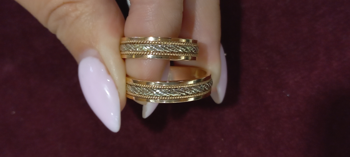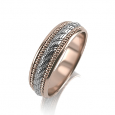 Обручальное кольцо выполнено из комбинированного золота, в сочетании красного и белого, с применением техники нео-филигрань, являясь данью вековым традициям в поисках новых решений