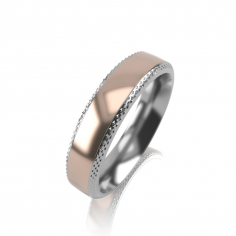 Классическое обручальное кольцо из двух цветов золота 585 пробы, края которого обработаны в технике "алмазная грань". Основание кольца выполнено из белого золота, а середина из красного золота.
