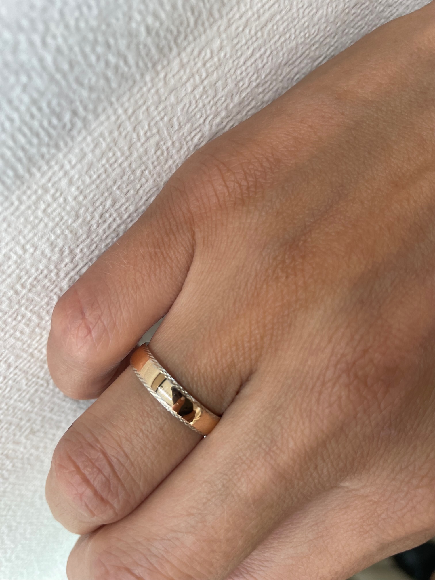 Классическое обручальное кольцо из двух цветов золота 585 пробы, края которого обработаны в технике "алмазная грань"