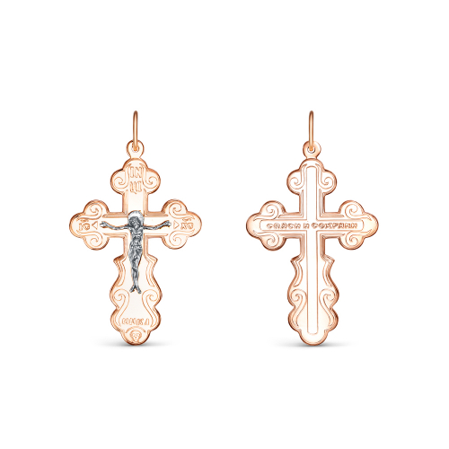 Подвеска в виде классического нательного креста выполнена из комбинированного золота 585 пробы.