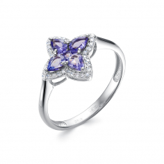 Кольцо с природными танзанитами, красоту которых подчёркивает дорожка сверкающих бриллиантов, выполнено из белого золота 585 пробы