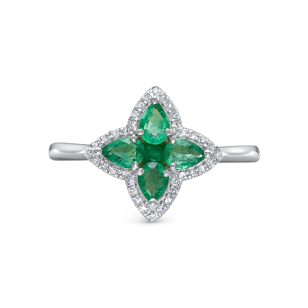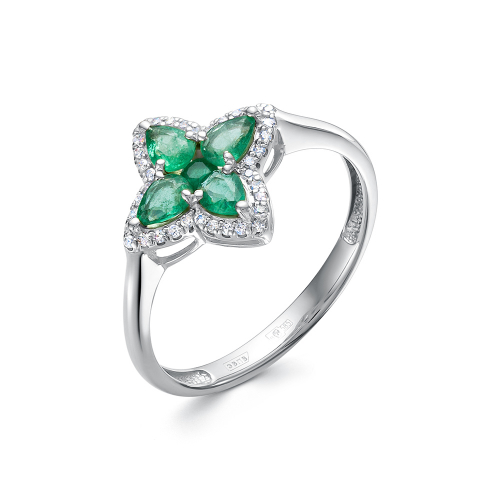 Яркое кольцо с натуральными изумрудами в инкрустации россыпи сверкающих бриллиантов выполнено из белого золота 585 пробы