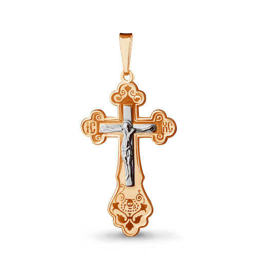 Православный крест выполнен в сочетании красного и белого золота 585 пробы, в нем исполнены все каноны Православной Церкви, на внешней стороне креста распятие, на обороте надпись "спаси и сохрани"