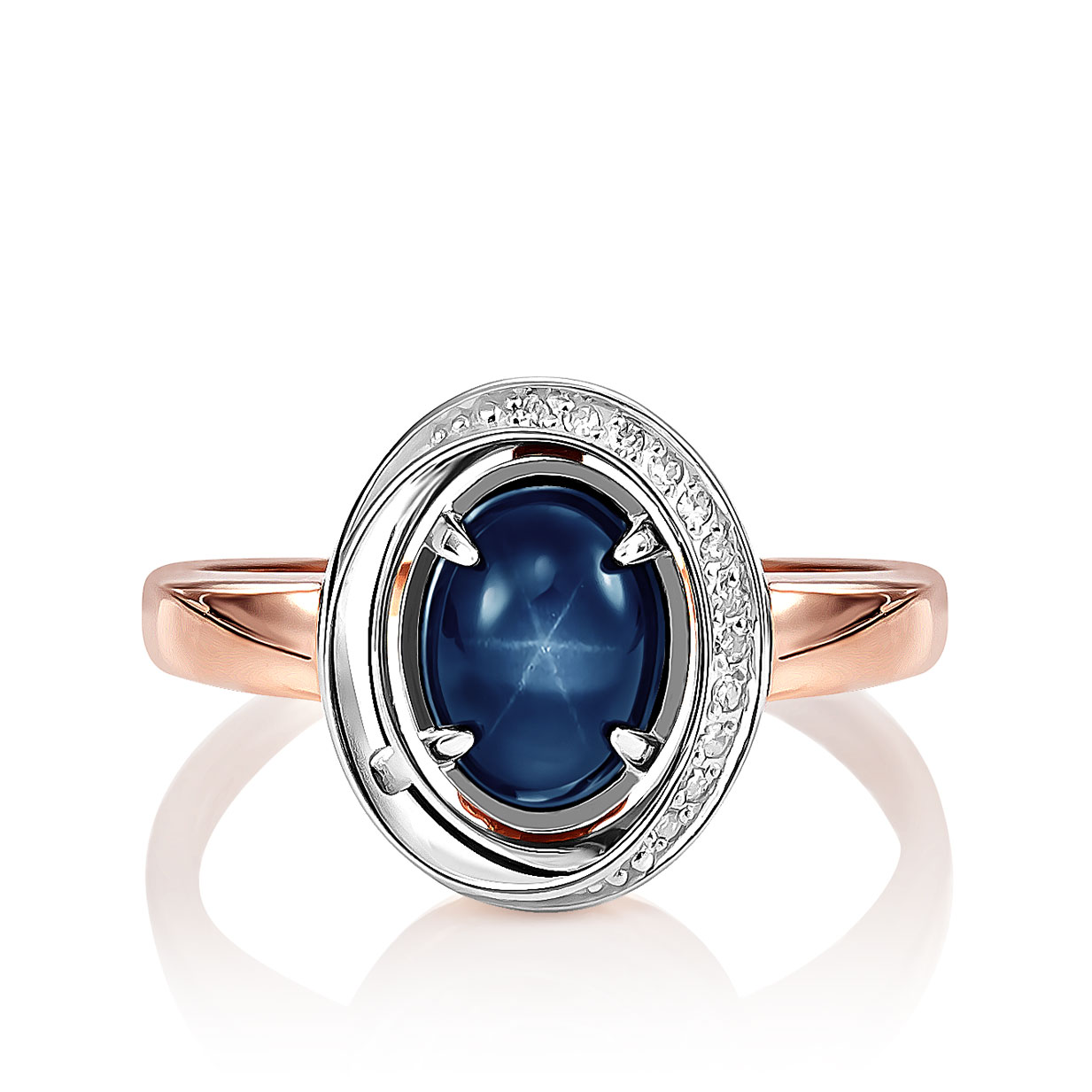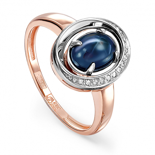 Роскошное кольцо, выполнено в сочетании красного и белого золота 585 пробы, украшено сапфиром звездным синего цвета и сияющей россыпью бриллиантов