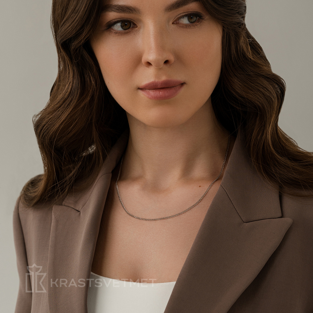 Полновесная цепь из белого золота 585 пробы с плетением «Двойной ромб» и бриллиантовым блеском станет отличным дополнением гардероба как для мужчин, так и для женщин. Уникальная конструкция обеспечивает особую прочность, а специальная обработка поверхности дарит блеск и выразительность каждому звену. Цепь органично сочетается как с деловыми комплектами мужчин, так и с женственными нарядами, подчёркивая высокий статус и отличный вкус её обладателей. Диаметр проволки 0,30 мм. Представлено брендом КРАСЦВЕТМЕТ.