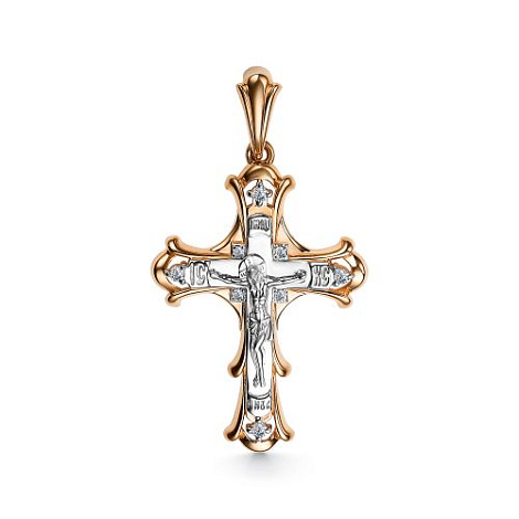 Подвеска, в виде православного креста, выполнена с сочетанием красного и белого золота 585 пробы и украшена сияющими бриллиантами