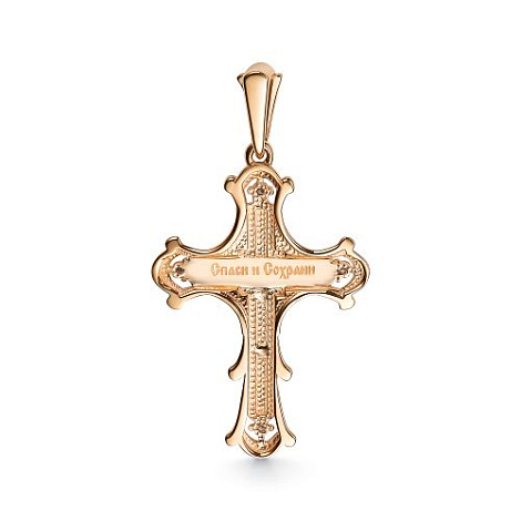 Подвеска, в виде православного креста, выполнена с сочетанием красного и белого золота 585 пробы и украшена сияющими бриллиантами. На оборотной стороне надпись "Спаси и Сохрани". Закрепка камней на белом золоте зрительно увеличивает их объём и усиливает сияние и блеск.